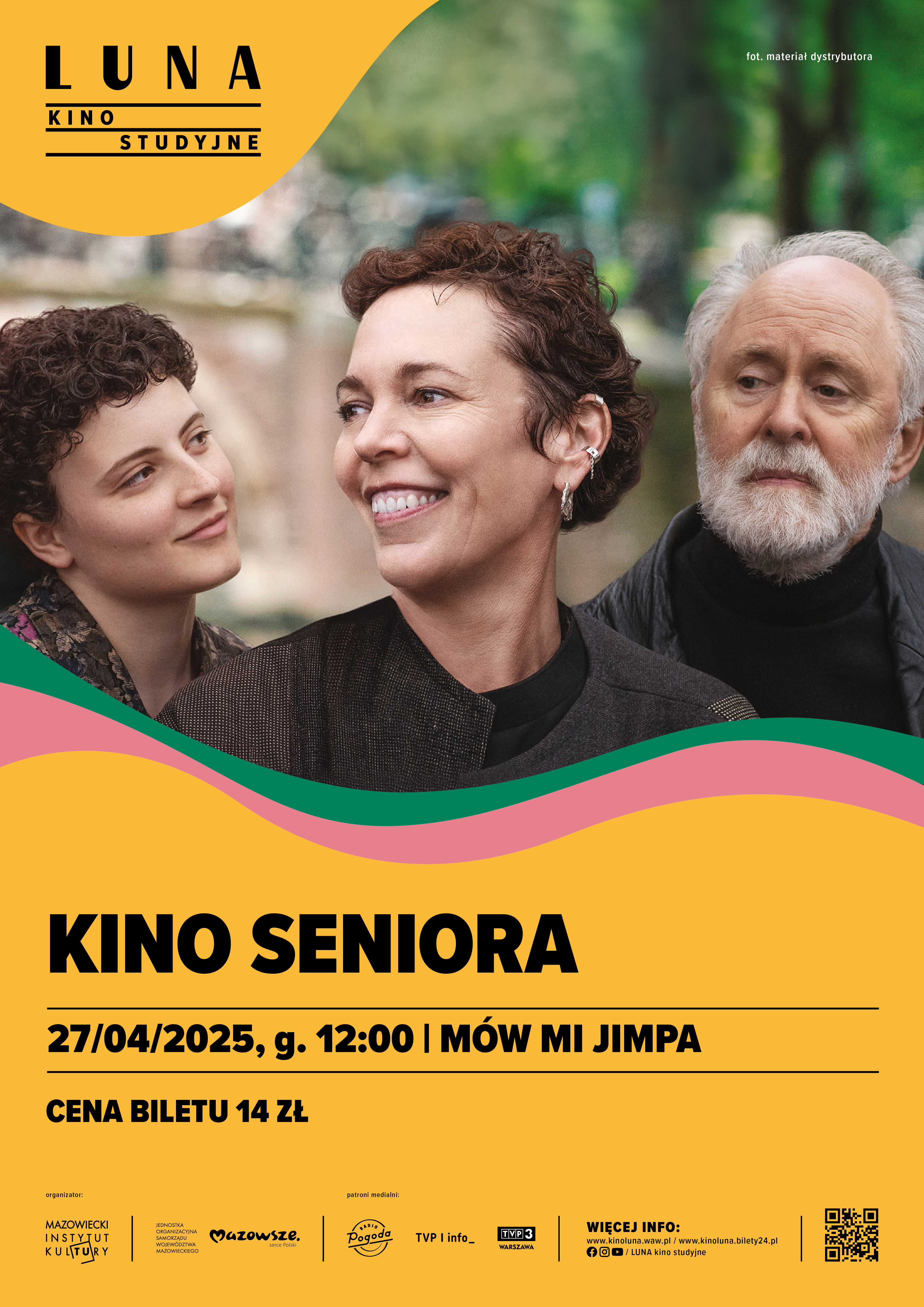 Kino Seniora to cykl seansów filmowych skierowany do widzów 60+, którzy cenią ambitne kino, dobre historie i komfortowe warunki oglądania.Zapraszamy na spotkania filmowe w spokojnej, przyjaznej atmosferze - w samo południe, z tańszymi biletami i repertuarem dobranym specjalnie z myślą o dojrzałej widowni.W każdy poniedziałek, zawsze o godz. 12:00, stała cena biletu 14 zł.Opis filmu:„Mów mi Jimpa” to najnowszy film reżyserki Sophie Hyde („Powodzenia, Leo Grande”). Do kin trafi już 3